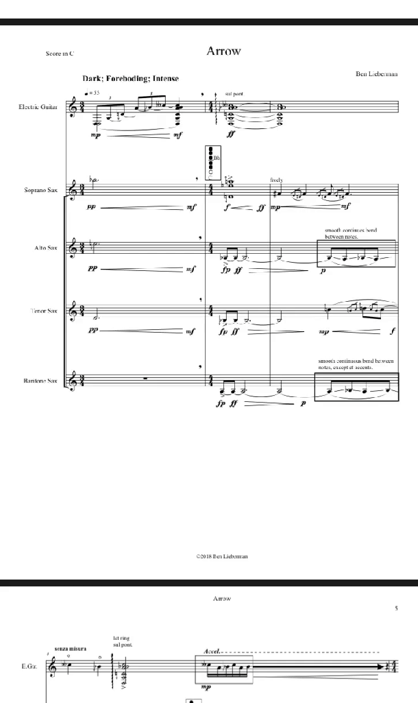 Arrow is my first real foray into the magical world of microtonality. It mostly uses quarter-tones, but there are all sorts of unstable, untempered pitches in there too, thanks to the nature of saxophone multiphonics. It is also the first piece I wrote in which I utilized a non-standard guitar tuning, in this case, a microtonal tuning with some strings tuned a quarter-tone away from the conventional half-step.